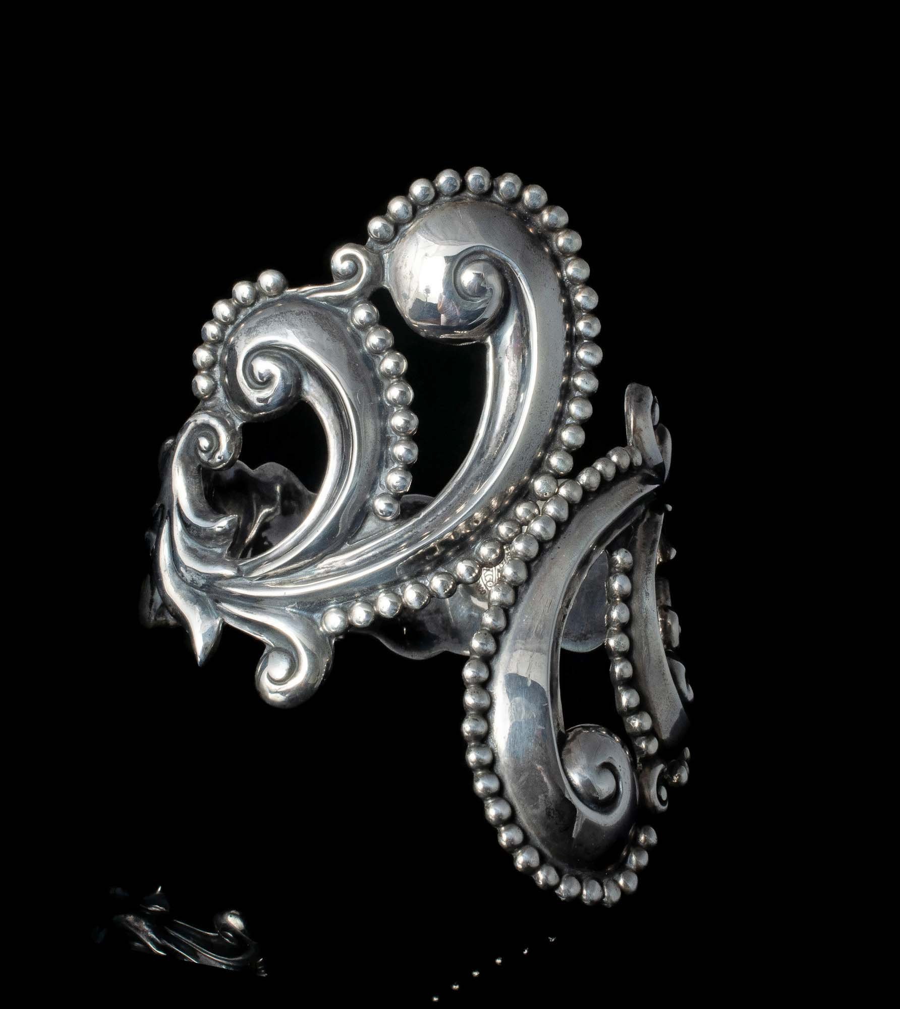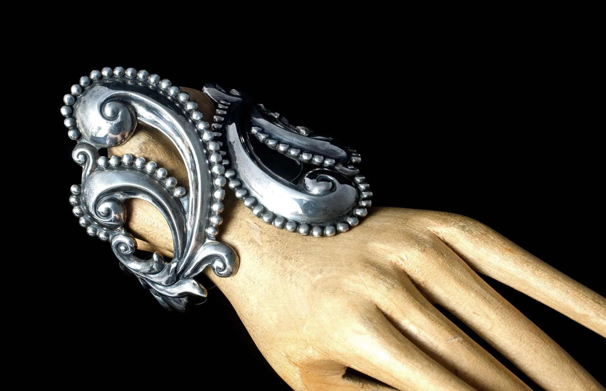 It's been a while since I presented a piece by Gerardo Lopez but he is one of my favorite Taxco maestros, a talented silversmith and designer who excelled in the art of repoussage. I believe Lopez was at his best when he created pectoral necklaces and clamper bracelets and it is an exquisite example of the latter form that I am showing here. Definitely inspired by Los Castillo and Margot de Taxco (I have suggested in the past that Lopez must have worked for either one or both of the famous workshops) this is a glorified "feather and bead" design, bold in the way the motifs unfold themselves, perfectly finished and undoubtedly not for the faint-of-heart. Imagine it worn over a long, black sleeve...